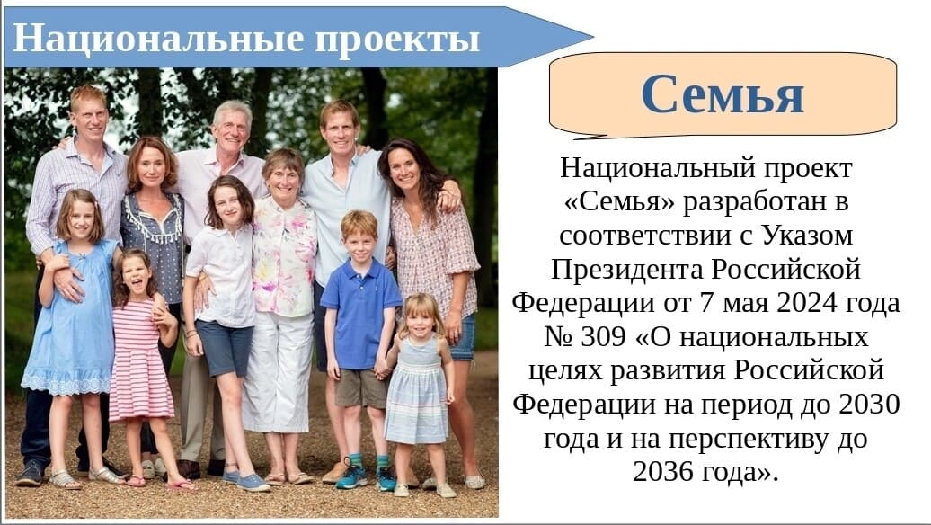 Национальный проект «Семья» является продолжением действовавших в 2019-2024 годах национальных проектов «Демография», «Культура».Национальный проект направлен на достижение показателей и задач национальных целей развития Российской Федерации на период до 2030 года «Сохранение населения, укрепление здоровья и повышение благополучия людей, поддержка семьи», «Реализация потенциала каждого человека, развитие его талантов, воспитание патриотичной и социально ответственной личности», «Комфортная и безопасная среда для жизни».